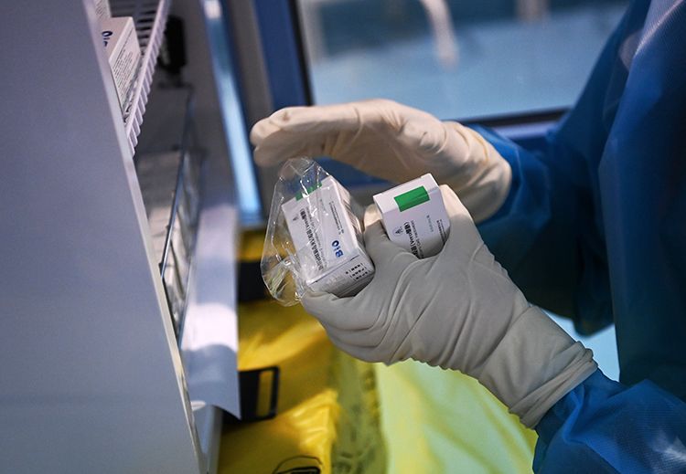 医护人员领取疫苗。