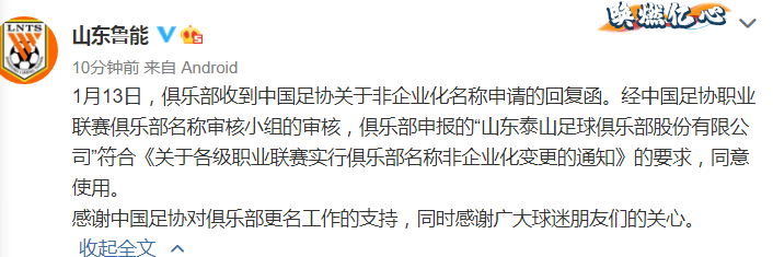 新京报讯 山东鲁能官方发布公告称,1月13日,俱乐部收到中国足协关于非企业化名称申请的回复函,“经中国足协职业联赛俱乐部名称审核小组的审核,俱乐部申报的‘山东泰山足球俱乐部股份有限公司’符合《关于各级职业联赛实行俱乐部名称非企业化变更的通知》的要求,同意使用。”