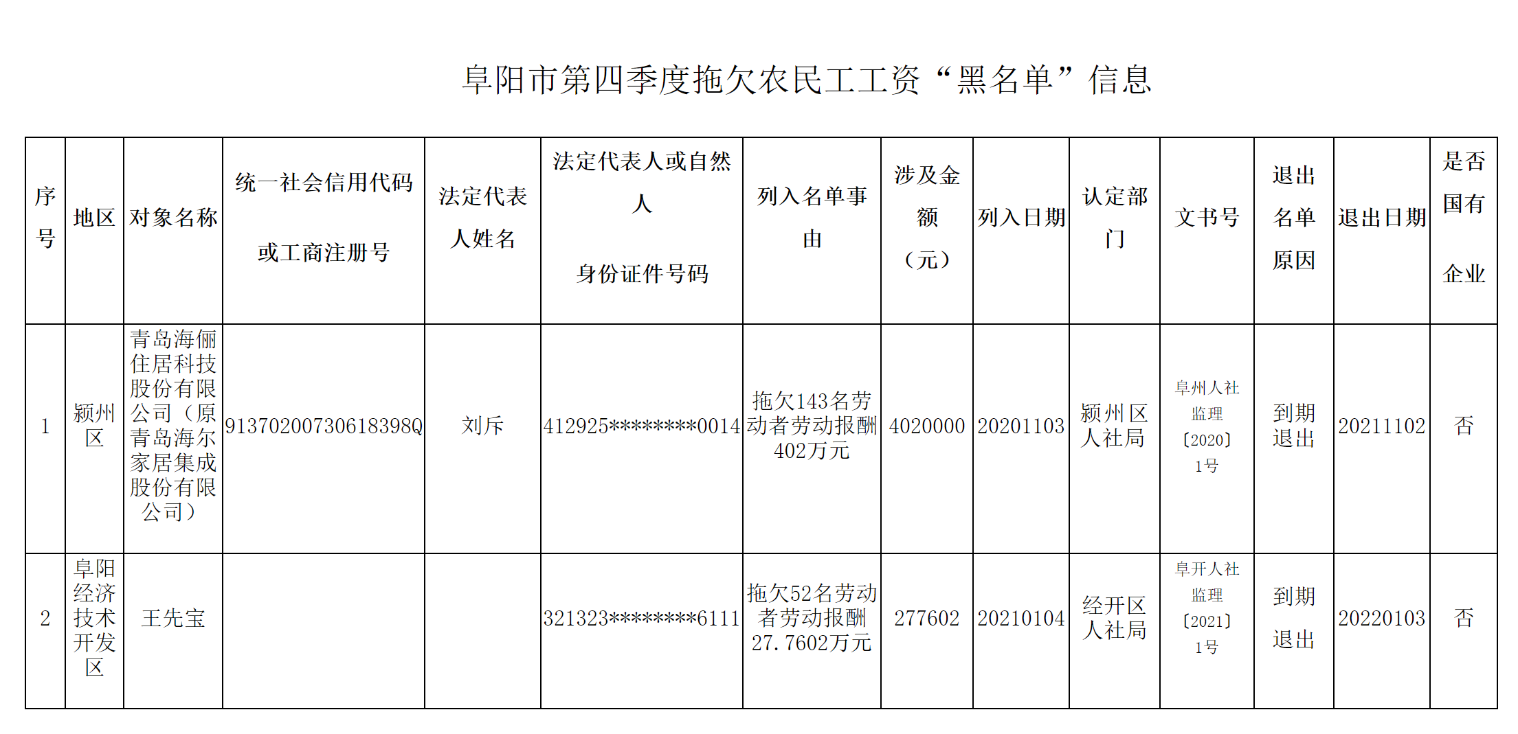 近日,安徽省阜阳市人力资源和社会保障局发布了“第四季度拖欠工资‘黑名单’及重大劳动保障违法行为企业(个人)名单”的公告,内容显示,青岛海俪住居科技股份有限公司(原青岛海尔家居集成股份有限公司)因拖欠143名劳动者劳动报酬402万元被列入黑名单,认定部门为颍州区人社局。