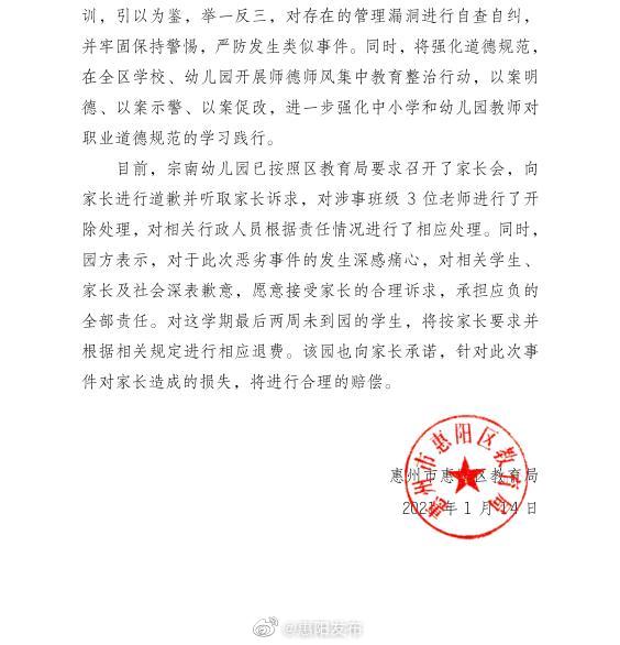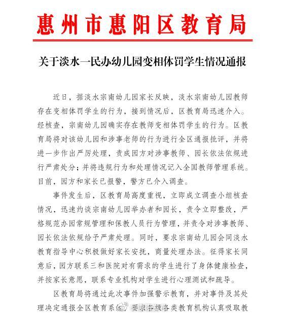 新京报快讯 据@惠阳发布官博消息,1月14日,惠州市惠阳区教育局发布《关于淡水一民办幼儿园变相体罚学生情况通报 》。近日,据淡水宗南幼儿园家长反映,淡水宗南幼儿园教师存在变相体罚学生的行为,接到情况后,惠州市惠阳区教育局迅速介入。经核查,宗南幼儿园确实存在教师变相体罚学生的行为。教育局将对该幼儿园和涉事老师的行为进行全区通报批评,并将进一步作出严厉处理,责成园方对涉事教师、园长依法依规进行严肃处分;并将违规行为和处理情况记入全国教师管理系统。目前,园方和家长已报警,警方已介入调查。
