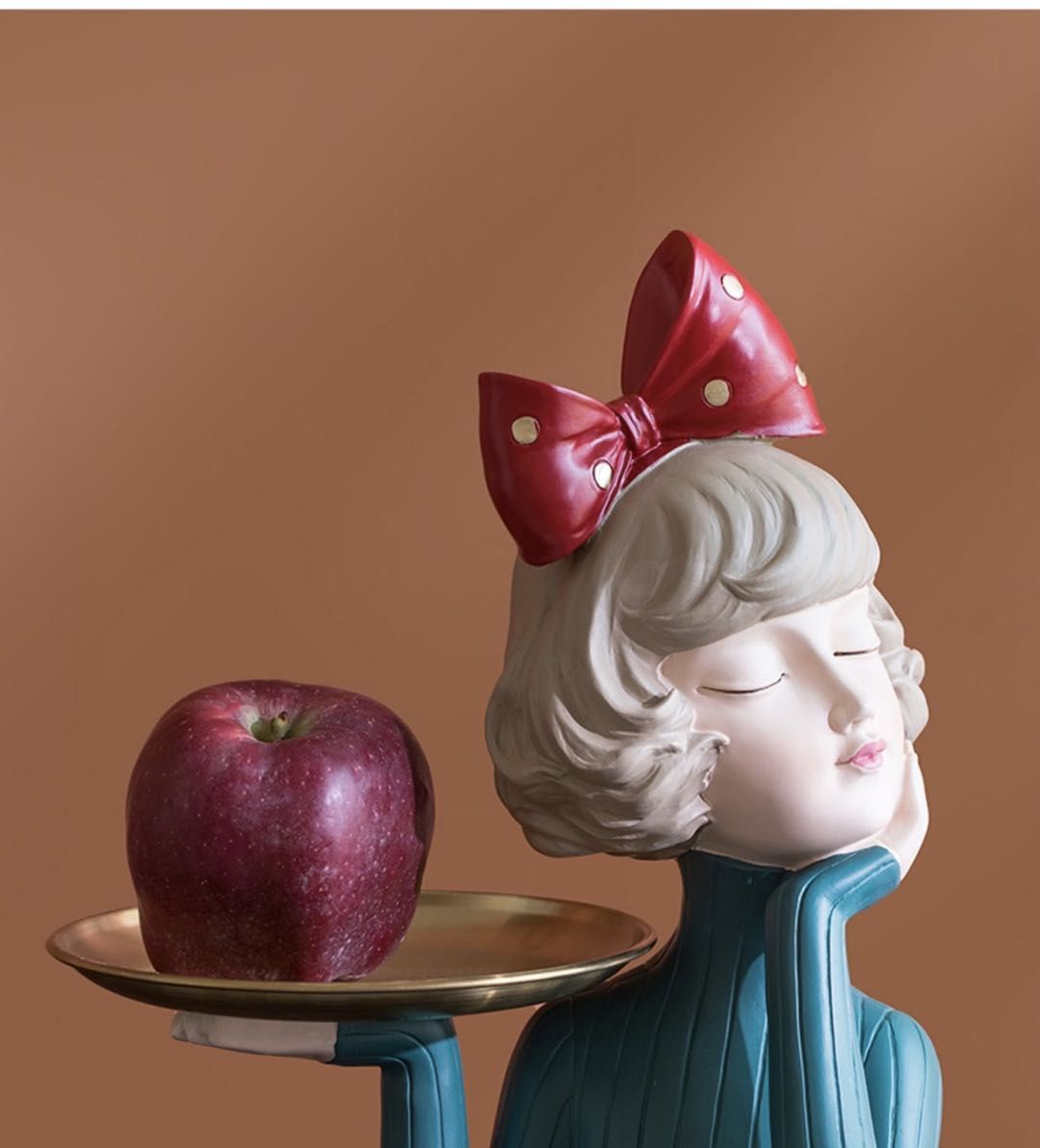 这款果盘的创意造型充满童趣和梦幻。可爱的小女孩穿着一款蓝色条纹的高领毛衣,齐耳短发上扎着一款大大的红色蝴蝶结,她左手托腮、右手托盘,闭上眼睛仿佛在思考,也仿佛在畅想,灵动美丽的表情充满了心灵的治愈感。品尝蝴蝶结女孩“端”来的美味,水果的甜美程度似乎会翻倍。