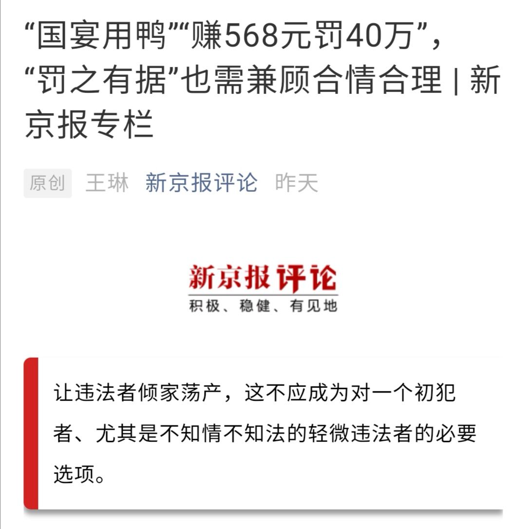海南万宁“国宴用鸭案”因40万元巨额罚款,引发各方关注。1月16日,我在新京报撰文指出,“罚之有据”也需经受过罚相当与必要性的考量。让违法者倾家荡产,不应成为对一个初犯者、尤其是不知情不知法的轻微违法者的必要选项。对这一观点,支持者众多。当然,也不乏针尖对麦芒的反对声音。如有网友就评论称,有法必依,执法从严!更有网友表示,对违法者的例外,就是对守法者最大的不公。