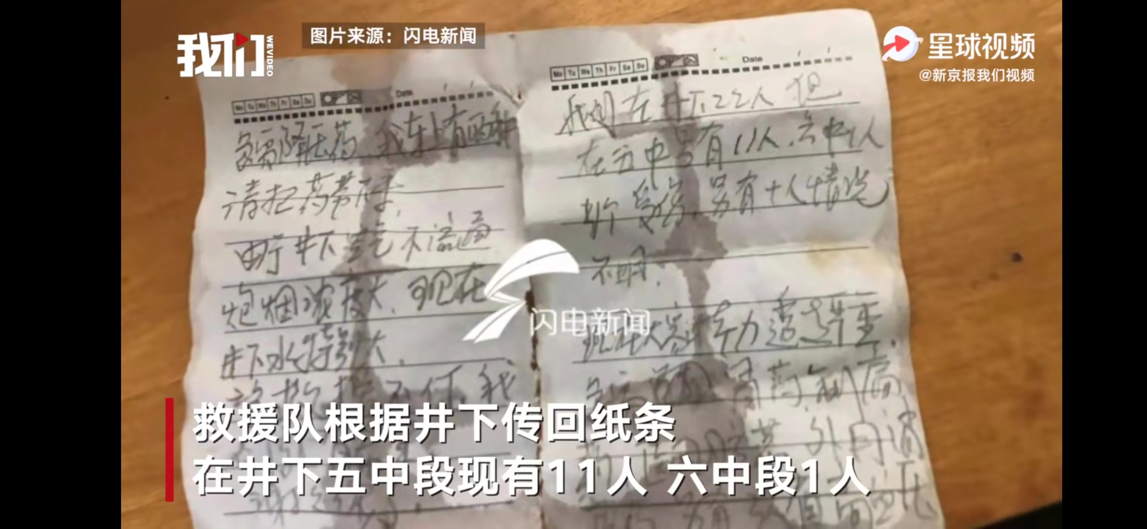 井下传回的纸条显示,“我们在井下22人,井下五中段现有11人,六中段1人,另有十人情况不明。