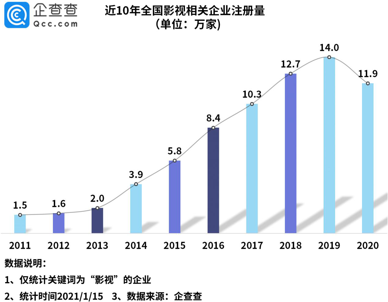 企查查数据显示,近10年来,全国影视相关企业年注册量逐年递增,2010-2013年均注册量为1.7万家。2014年起行业进入快速发展阶段,当年增长率是10年来最高的,同比增长94%,注册量达3.9万家。2019年,相关企业注册量达14万家,同比增长10%,2020年共新增11.9万家相关企业,同比下降15%。