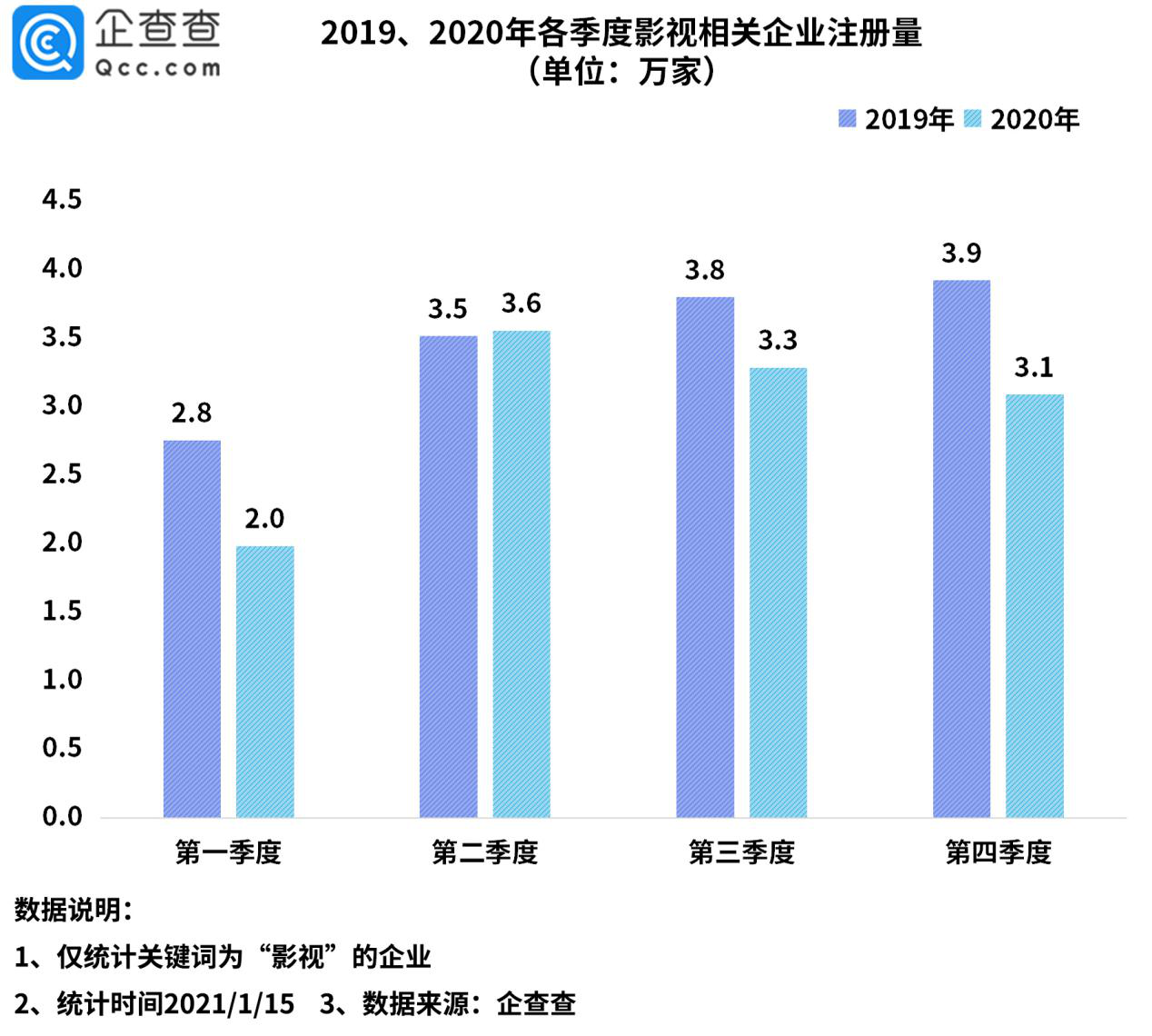 从季度数据来看,企查查数据显示,2020年一季度仅新注册2万家,同比下降28%。二季度回升至3.6万家,与2019年同期基本持平,也是全年注册量最多的一个季度。三、四季度注册量分别为3.3万家、3.1万家,均呈同比下降。