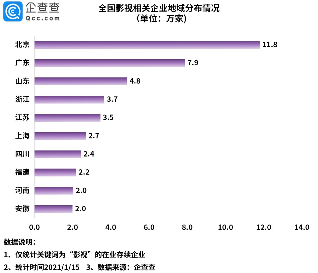 地域分布方面,企查查数据显示,北京拥有的影视相关企业数量最多,达11.8万家,占全国总量的18%,远超其他省份,广东与山东分别以7.9万家、4.8万家排名二三位。