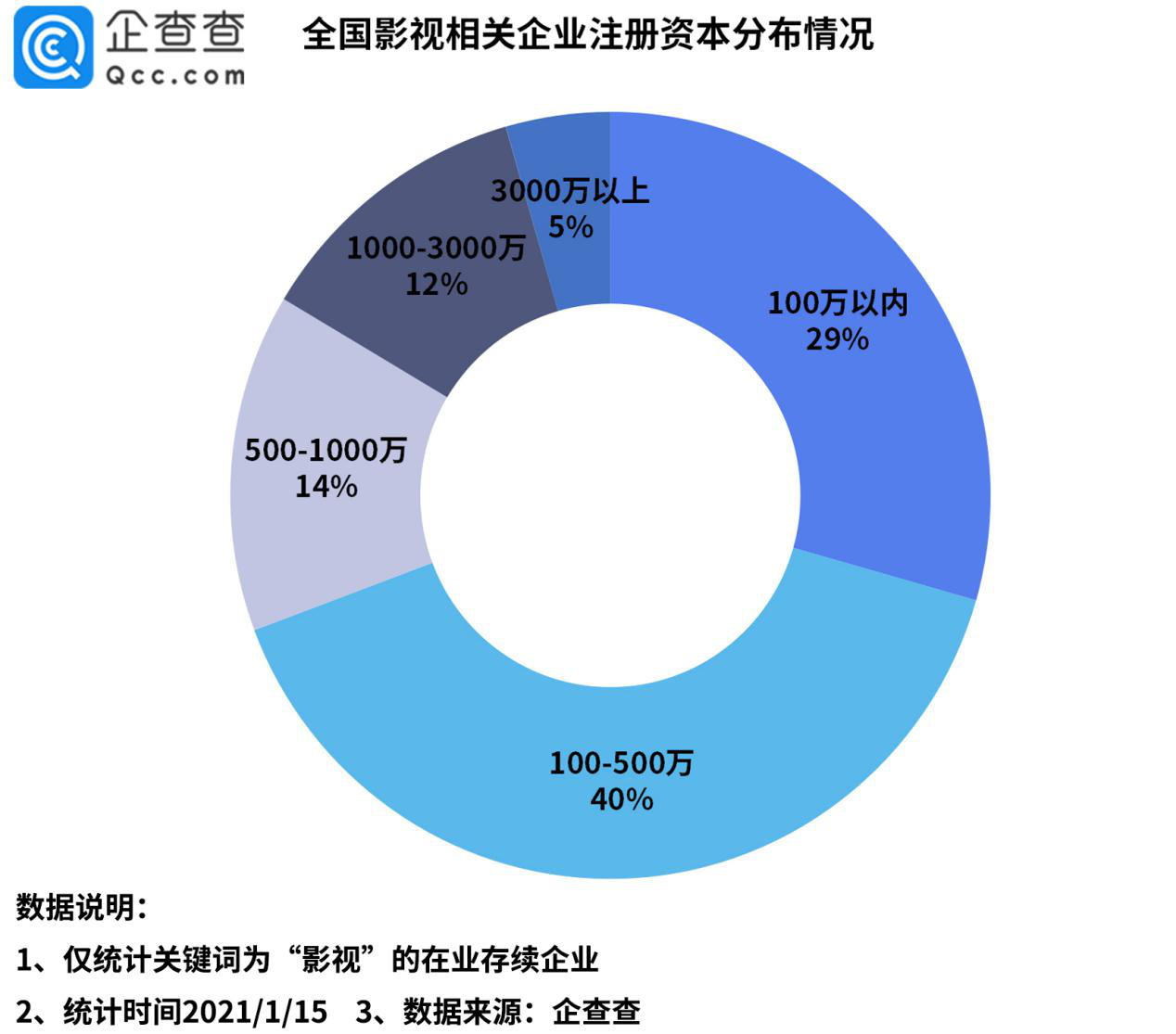 从注册资本看,企查查图表显示,近7成的影视相关企业注册资本在500万以内,占据了行业的大多数,其中注册资本在100万以内和100万-500万的,分别占总量的29%和40%。而注册资本在3000万以上的占5%。
