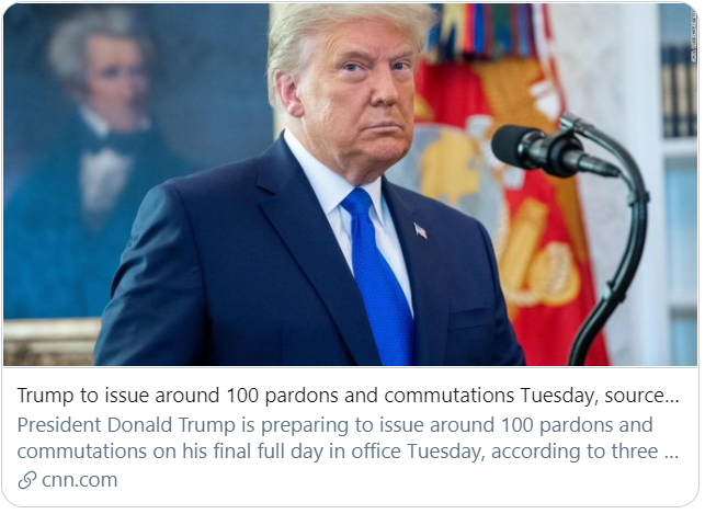 除了想要一个“华丽的告别”,特朗普还打算在执政尾声,利用好手中最后的权力。当地时间1月17日,据美国有线电视新闻网(CNN)报道,三名知情人士透露,特朗普准备在当地时间1月19日发布约100项赦免和减刑命令。