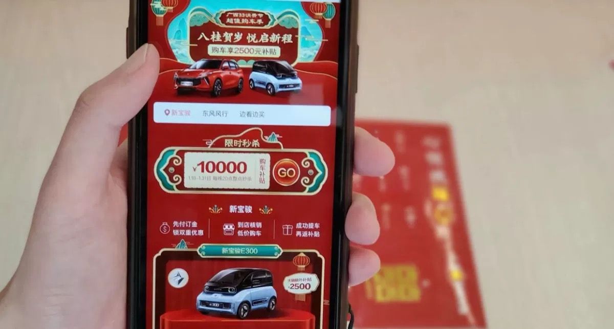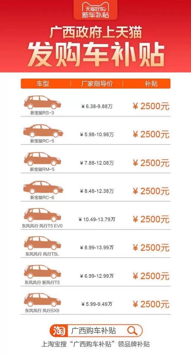 消费者在淘宝App搜索“广西购车补贴”,进入会场购买广西生产的“新宝骏”、“东风风行”汽车时,即可申领每台2500元购车补贴。