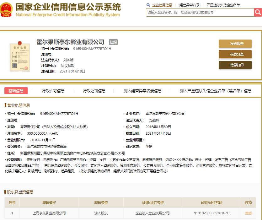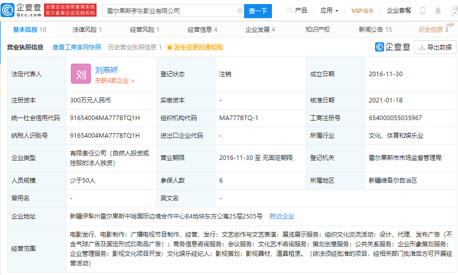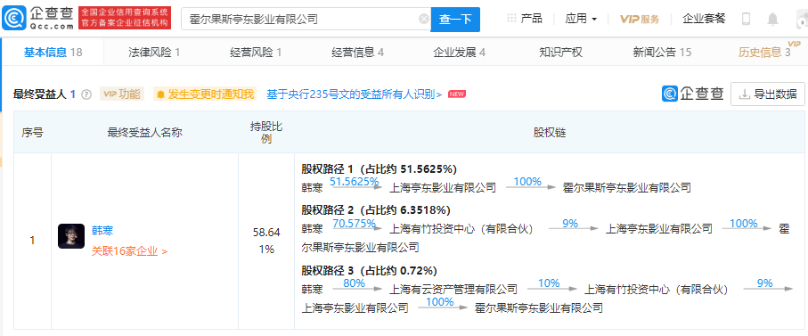 霍尔果斯亭东影业有限公司注销,该公司最终受益人为韩寒