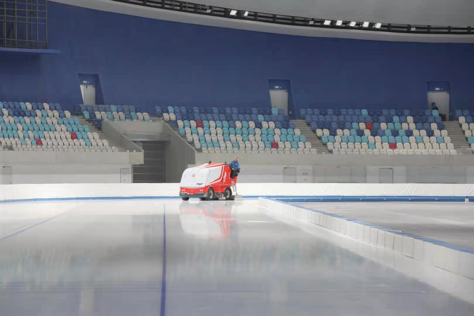 为了确保冰面质量满足冬奥会比赛标准,北京2022冬奥会组委会体育部特聘制冰专家与国内、外制冰师联合进行国家速滑馆首次制冰。经过底板清洁、底冰浇筑、喷漆划线、分层多次浇冰、冰眼敷设、防撞垫安装多道工序,首次制冰顺利完成。