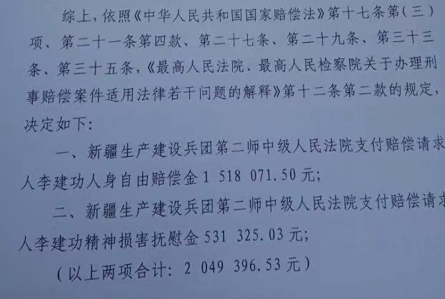 2021年1月20日,新疆生产建设兵团第二师中级人民法院作出的《国家赔偿决定书》显示,因法院的错误判决,致使李建功被羁押4378天,人身自由受到侵害,日常生活、工作、社会评价都受到影响,法院应在侵权行为影响的范围内,为李建功消除影响,恢复名誉,赔礼道歉,并支付精神损害抚慰金。最终决定赔偿李建功人身自由赔偿金151.8万余元、精神损害抚慰金53.1万余元,两项共计204.9万余元。