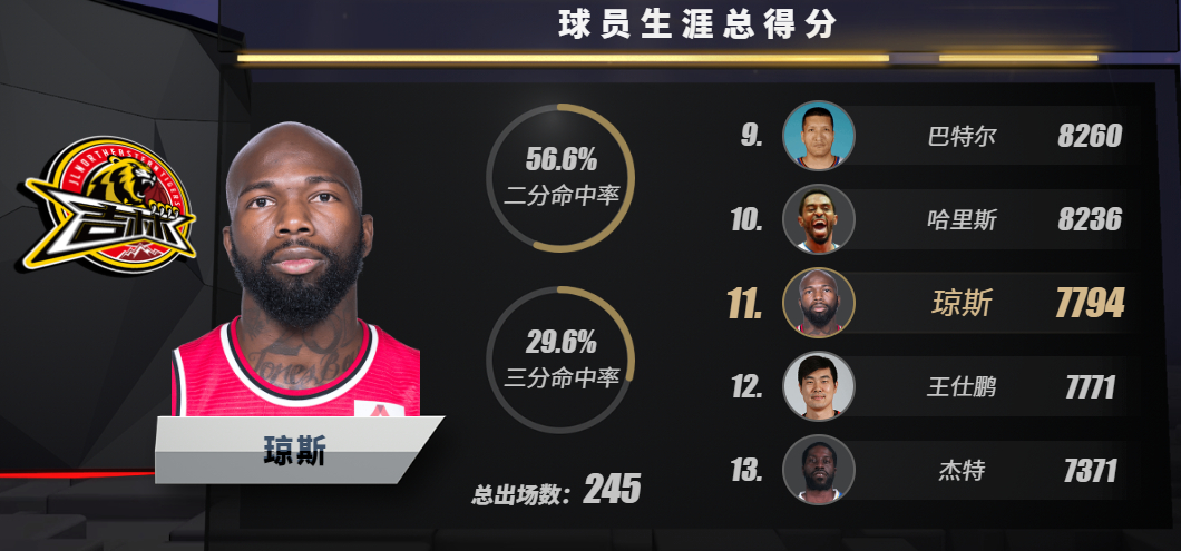 得分方面,吉林队琼斯狂砍37分、16个篮板和10次助攻,CBA生涯总得分7794,超越王仕鹏,升至得分榜第11位。姜宇星贡献21分、7个篮板、6次助攻,崔晋铭得到13分,丁皓然13分。