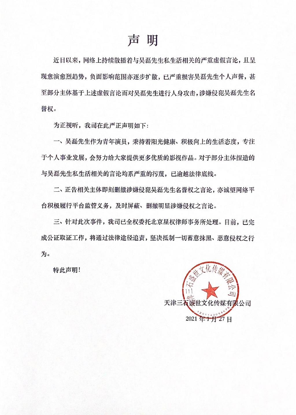 吴磊工作室发声明,针对其私生活虚假言论已完成取证