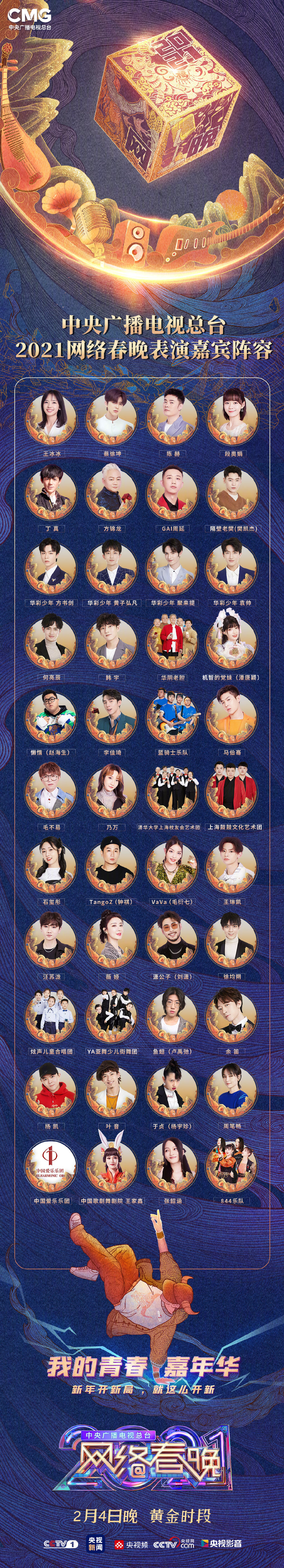 据悉,2021网络春晚将于2月4日晚黄金时间在CCTV-1综合频道、央视网、央视频客户端、央视新闻客户端等渠道同步播出。