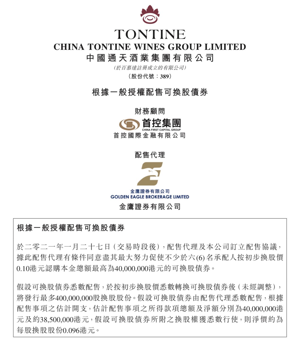 通天酒业:公司筹集额外资金的最后手段,拟发行可换股债券