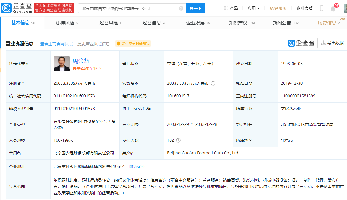 企查查APP显示,北京中赫国安足球俱乐部有限责任公司为北京国安足球俱乐部运营主体,成立于1993年,注册资本2.08亿元,经营范围显示为:组织足球比赛、足球运动员转会;组织文化体育活动;信息咨询(不含中介服务)等。据悉,北京国安足球俱乐部是中国大陆成立最早的一家职业俱乐部。