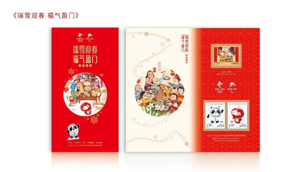 邮折封面大红色基调,由雪花、大门、全家福组成;邮折内含有《北京2022年冬奥会吉祥物和冬残奥会吉祥物》邮票一套2枚,《拜年》邮票一套1枚。纪念封卡折套装可作为新年贺卡,通过邮寄的传统方式向远方的亲友送去问候;还可插放压岁钱,作为新年红包传递祝福。
