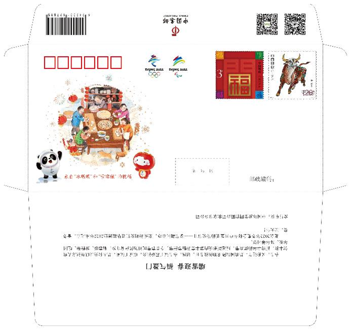 《瑞雪迎春 福气盈门》拜年封卡折套装是为庆祝北京2022年冬奥会倒计时一周年,同时迎接2021年春节而打造的一款年货,由一枚贴有辛丑年生肖邮票的拜年纪念封和插有拜年邮票与吉祥物邮票的邮折组成。