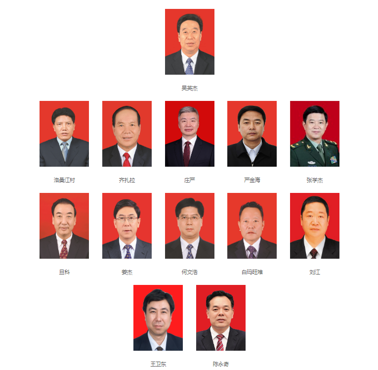 目前,西藏自治区党委常委班子有13人,党委副书记有4人:区人大常委会主任洛桑江村,区政府主席齐扎拉,区政府常务副主席庄严,拉萨市委书记严金海。