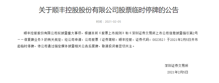 顺丰控股股份有限公司拟披露重大事项,根据本所《股票上市规则》和《深圳证券交易所上市公司信息披露指引第2号——停复牌业务》的有关规定,经公司申请,公司股票(证券简称:顺丰控股,证券代码:002352)于2021年2月5日开市起临时停牌,待公司通过指定媒体披露相关公告后复牌,敬请投资者密切关注。