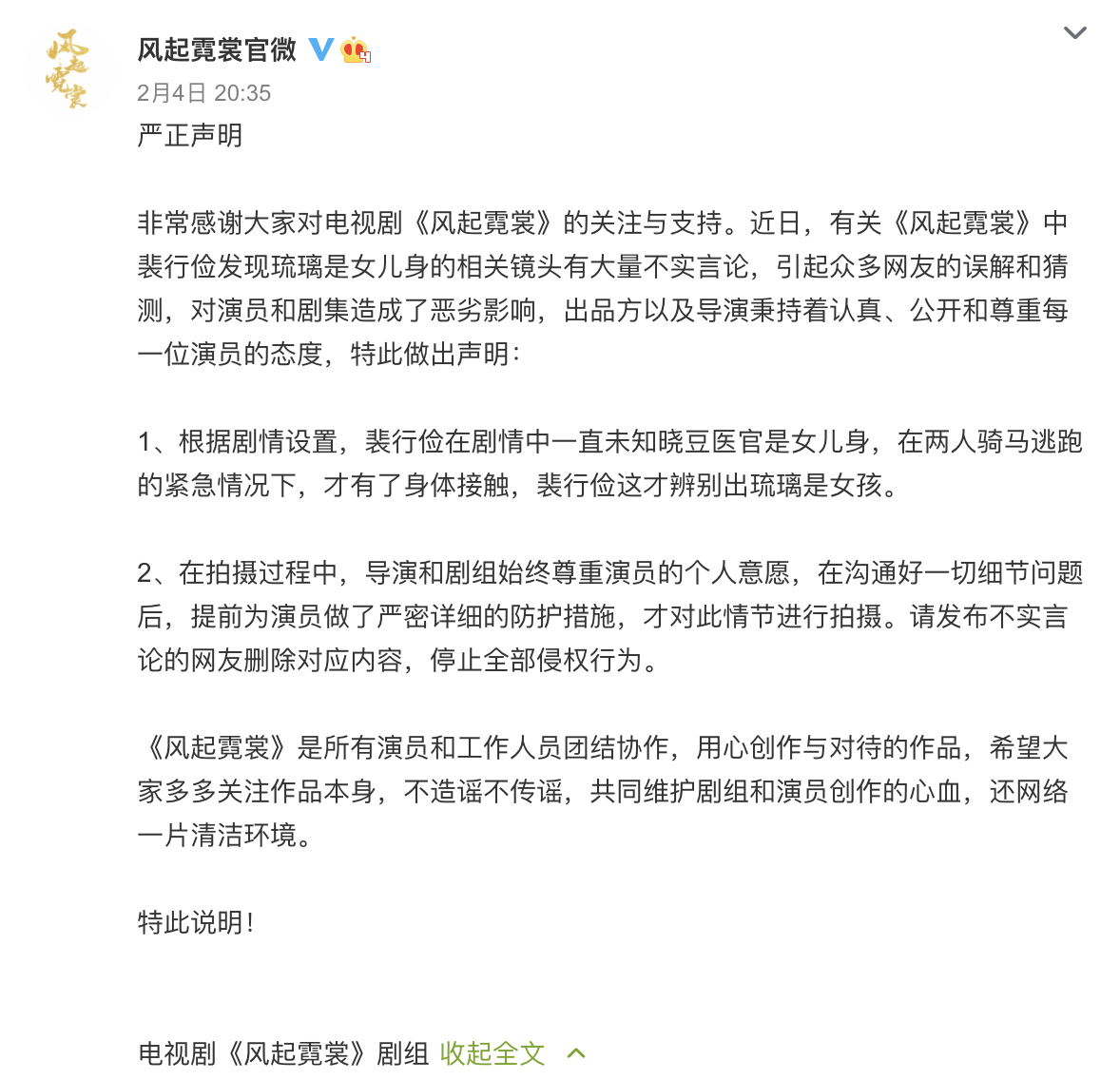 《风起霓裳》就争议镜头发声明:始终尊重演员的个人意愿