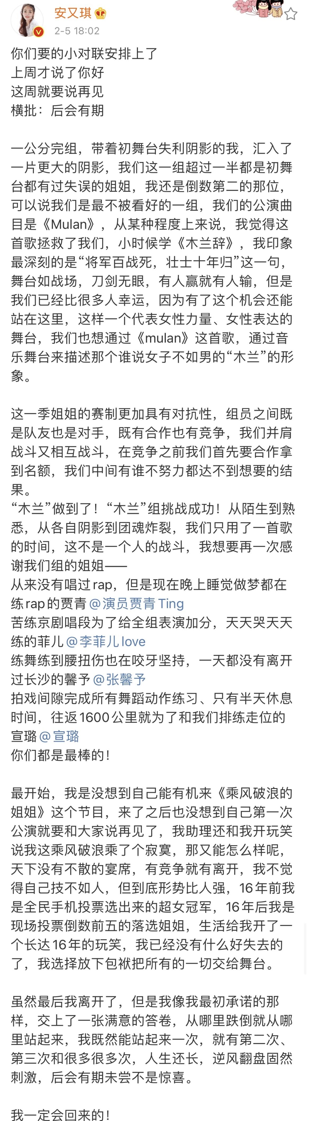 新京报讯 2月5日,首届《超级女声》冠军安又琪在社交平台发布长文,告别《乘风破浪的姐姐2》。