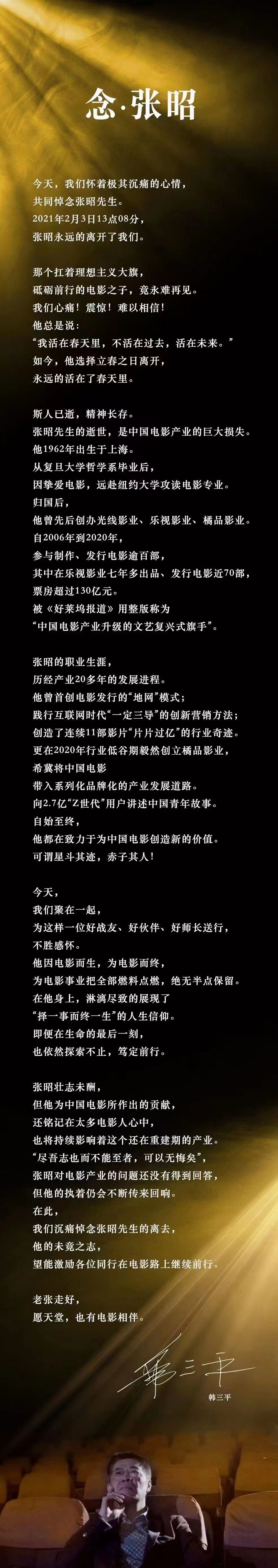 韩三平还表示:“我们沉痛悼念张昭先生的离去,他的未竟之志,望能激励各位同行在电影路上继续前行。老张走好,愿天堂,也有电影相伴。”