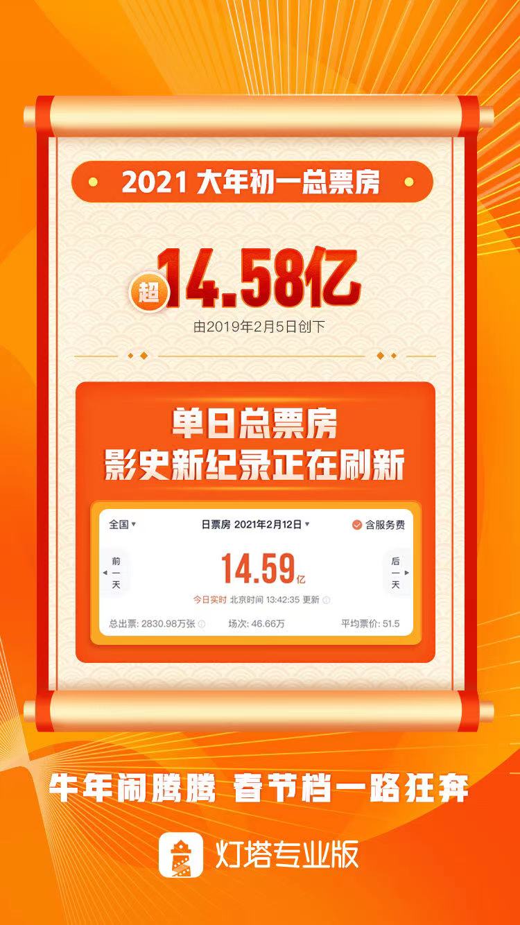 新京报讯 2月12日,根据灯塔专业版实时数据,截至2月12日13时42分,2021年大年初一总票房超14.58亿,打破由2019年初一创下的中国影史单日最高票房纪录。今年春节档单日观影人次已达2831万,场次46.7万。至截稿前,今日实时票房已达14.6亿,其中《唐人街探案3》累计票房破9亿,有望单日冲击11亿;《你好,李焕英》排名第二,累计票房2.3亿;《刺杀小说家》《熊出没:狂野大陆》纷纷破亿。