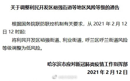 新京报快讯 据哈尔滨市委网络安全和信息化委员会办公室官微消息,哈尔滨市应对新冠肺炎疫情工作指挥部发布了《关于调整利民开发区裕强街道等地区风险等级的通告》,自2月12日12时起:将利民开发区裕强街道、利业街道,呼兰区呼兰街道风险等级调整为低风险。