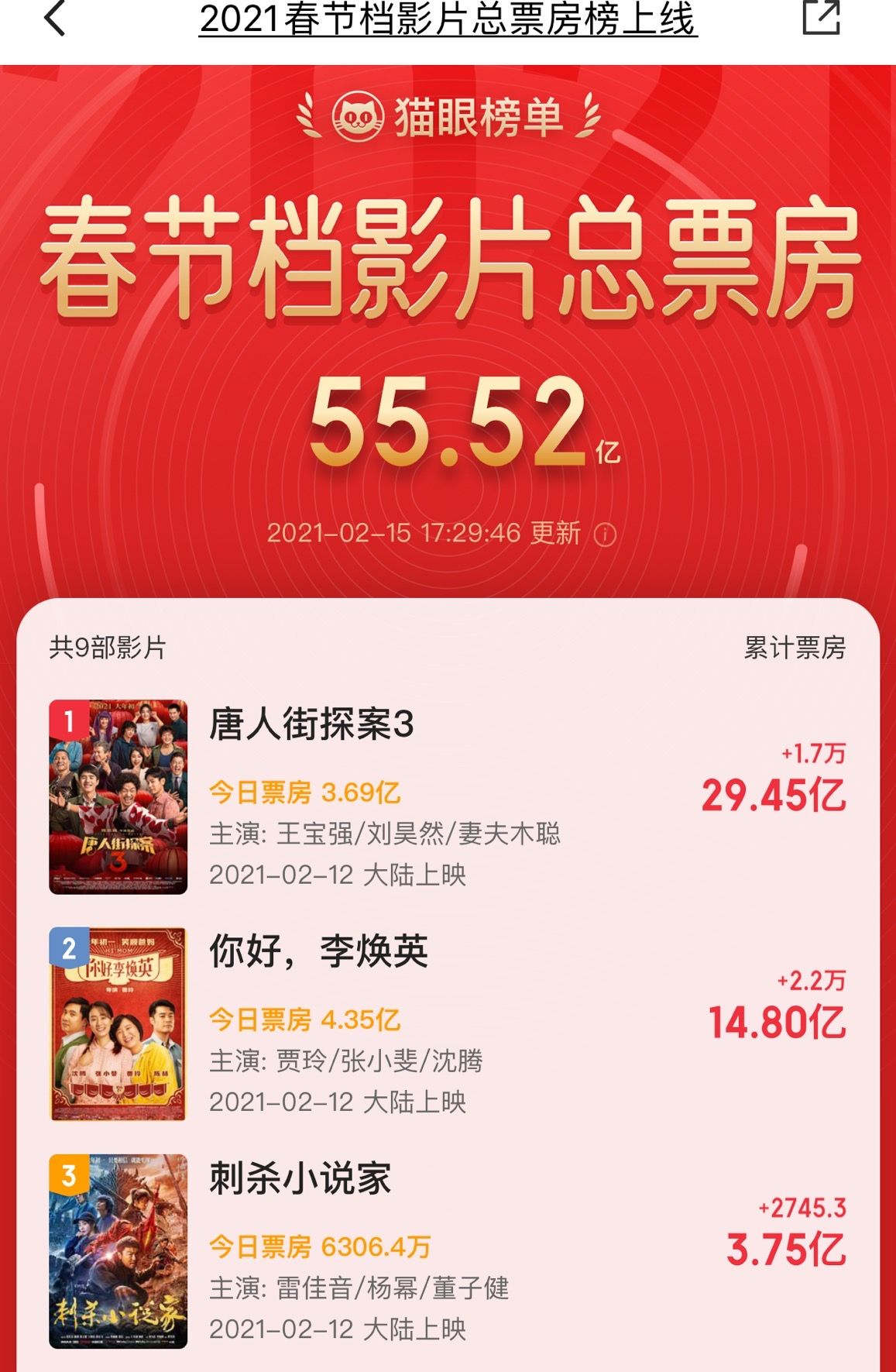 截至发稿前,春节档票房排第一的为《唐人街探案3》收获29.5亿,《你好,李焕英》票房14.8亿,《刺杀小说家》票房3.8亿。值得注意的是,2月15日《你好,李焕英》单日票房已达4.35亿,超过《唐人街探案3》的3.69亿元。