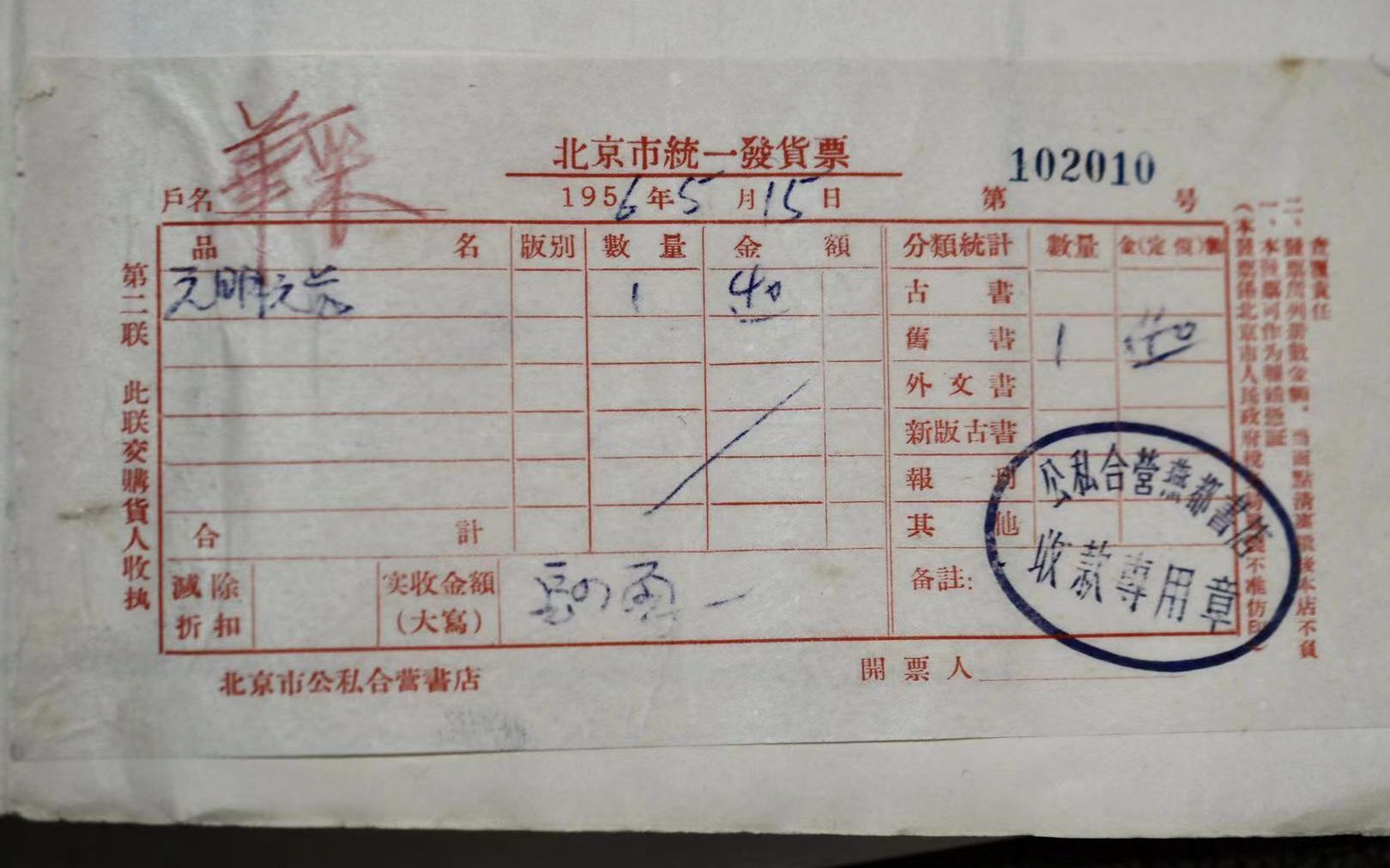 这张彩色实测图图纸面积在1平方米左右,保存完好,圆明园中的山石、水系、遗址、房屋等信息在图中清晰看见。在这张实测图的背面,捐赠者还保留了1956年5月15日购买时的发票,售价为0.40元,收款单位为“公私合营燕都书店”。