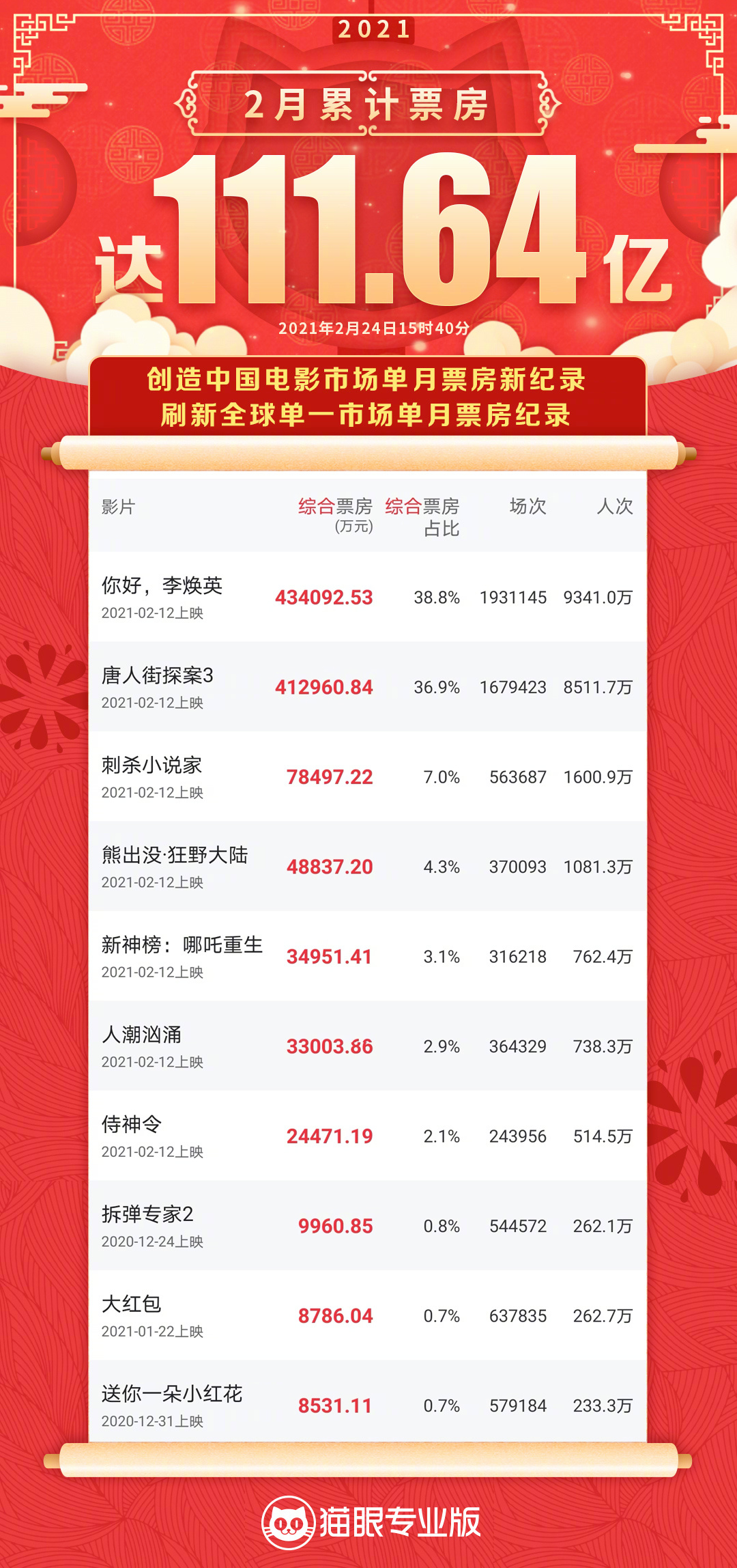 新京报讯 据猫眼专业版数据显示,截至2月24日15:40,2021年2月累计票房达111.64亿,创造了中国电影市场单月票房新纪录,也刷新了全球单一市场单月票房纪录。在2月累计票房榜中,《你好,李焕英》位居榜首,《唐人街探案3》紧随其后。