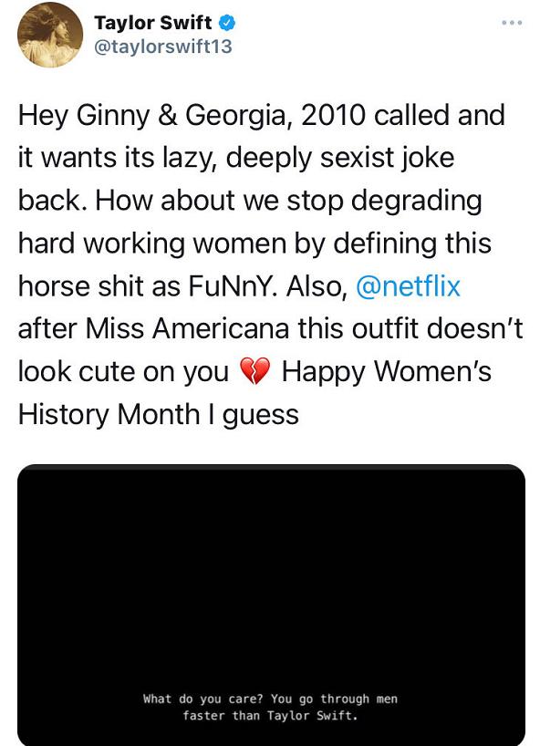 霉霉怼奈飞新剧,指责其拿自己的交往史博取笑料