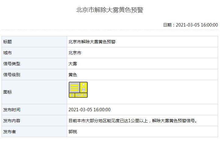 新京报快讯 据北京市气象局官网消息,目前本市大部分地区能见度已达1公里以上,市气象台2021年3月5日16时00分解除大雾黄色预警信号。