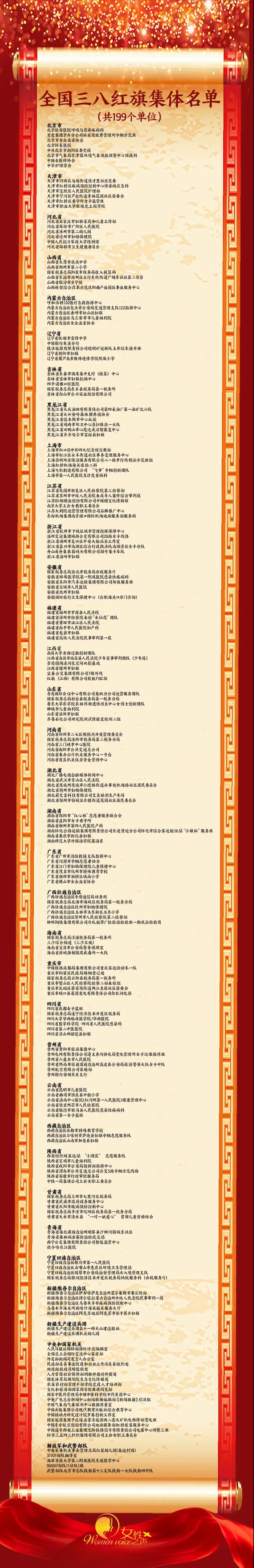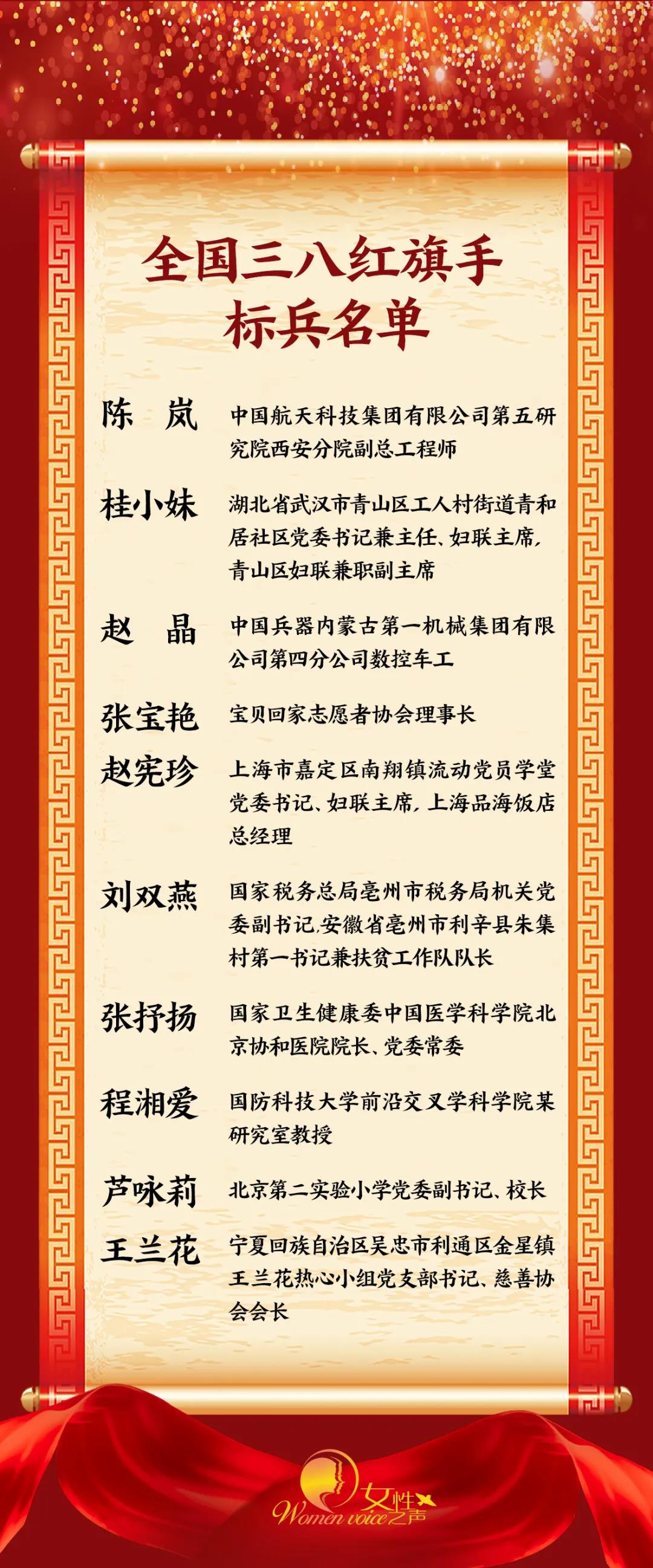 全国妇联授予陈岚等10人全国三八红旗手标兵、陈芳等300人全国三八红旗手、北京佑安医院呼吸与感染疾病科等199个单位全国三八红旗集体称号。