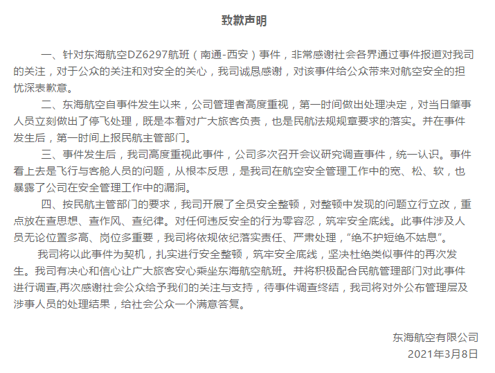 此前,东海航空已通过其官方微博发布了简短的致歉声明,全文如下: