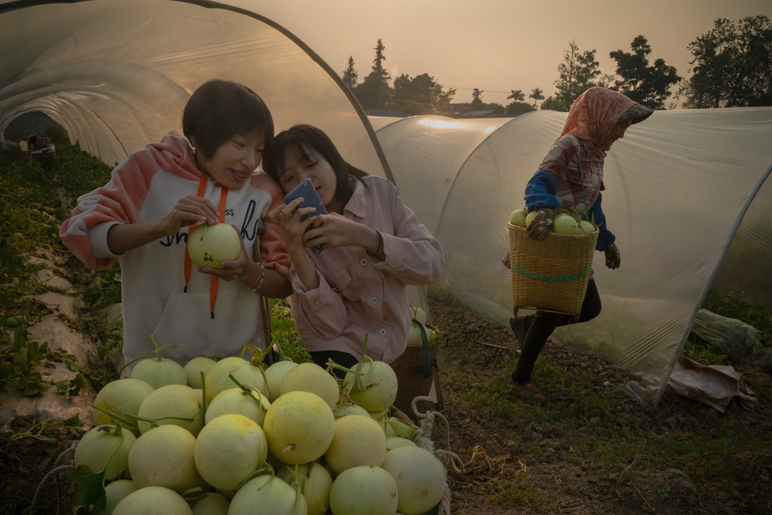 云南90后残疾姐妹花李木兰(左)和金玉萍(右)一边在地里整理刚摘的甜瓜,一边拿手机为用户线上答疑。