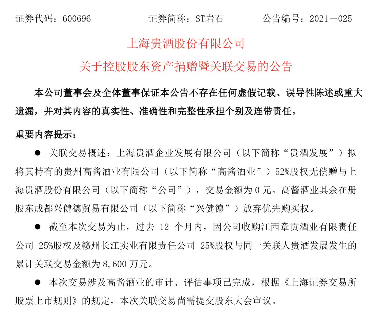新京报讯(记者 郑明珠)3月11日,ST岩石发布公告称,上海贵酒企业发展有限公司(以下简称“贵酒发展”)拟将其持有的贵州高酱酒业有限公司(以下简称“高酱酒业”)52%股权无偿赠与公司,交易金额为0元。高酱酒业其余在册股东成都兴健德贸易有限公司(以下简称“兴健德”)放弃优先购买权。