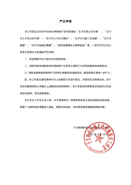 新京报快讯 14日,王子文工作室在其官博发布声明,称网传“王子文隐婚”、“王子文结婚又离婚”等言论均为虚假消息,工作室已委托律师针对侵权行为进行取证,并密切关注网络动态。以下为声明全文: