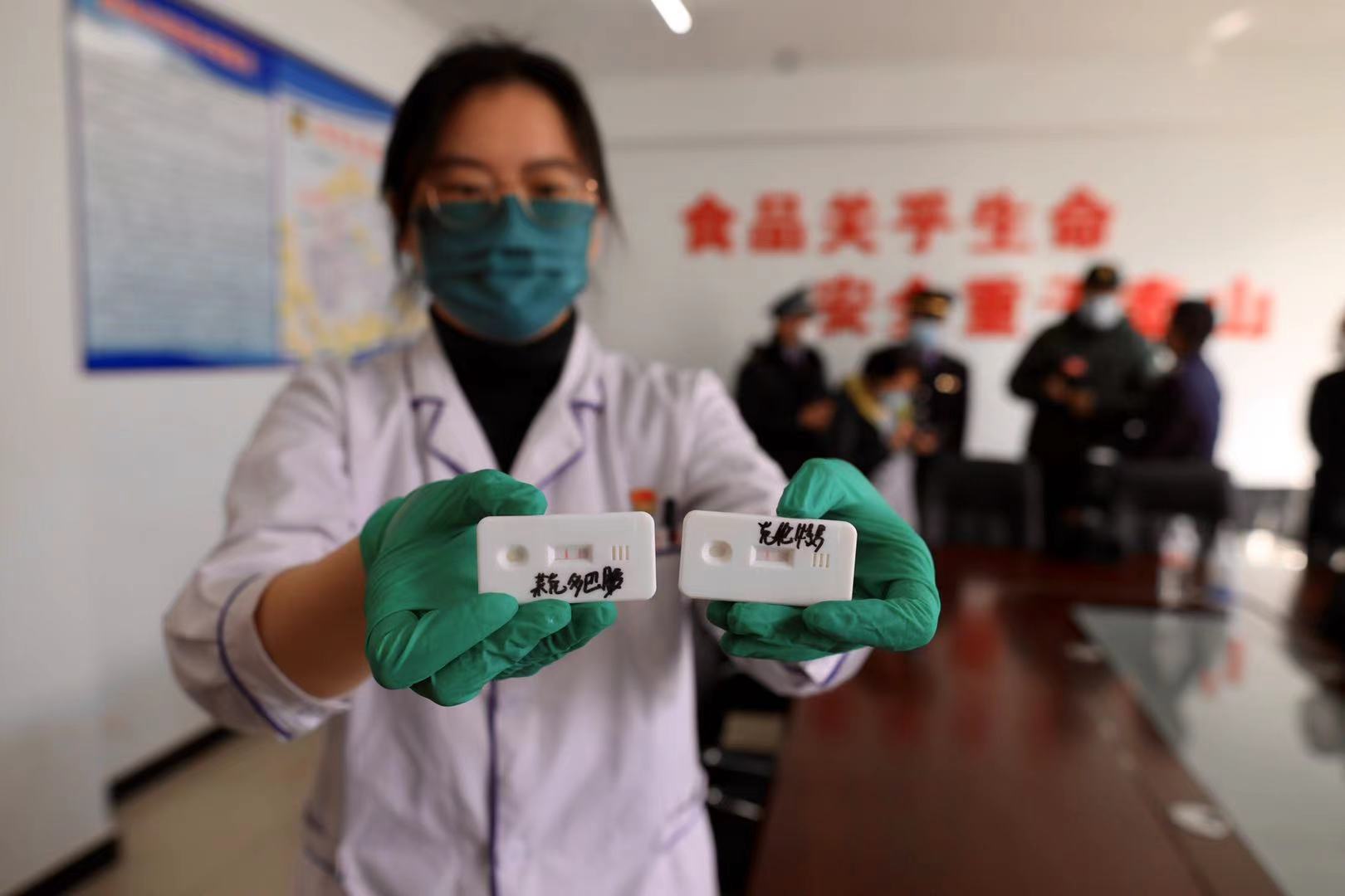 执法人员将加热后的羊肉放入检测试管,倒入试剂盒药液,再将混合羊肉的液体滴在检测卡上,大约几分钟,显色区出现两条检测线,“说明检测结果为阴性,羊肉中未添加瘦肉精”。