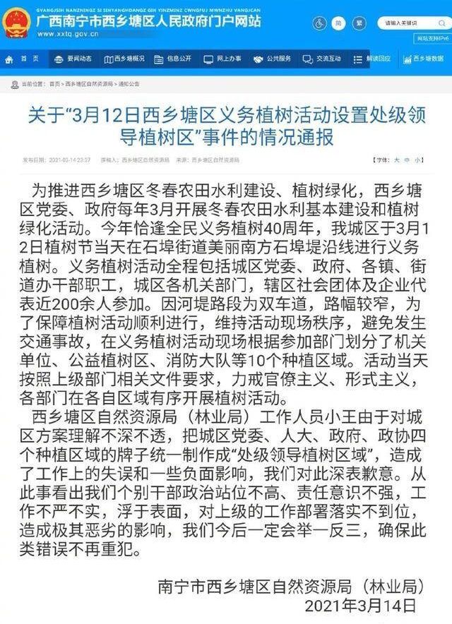 引发热议后,3月14日,西乡塘区自然资源局(林业局)发布情况通报,为此致歉,称是该局工作人员小王对城区方案理解不深不透,把城区党委、人大、政府、政协四个种植区域的牌子统一制作成“处级领导植树区域”,造成了工作上的失误和一些负面影响;还表示,此事反映出“我们个别干部政治站位不高、责任意识不强,工作不严不实,浮于表面,对上级的工作部署落实不到位”。
