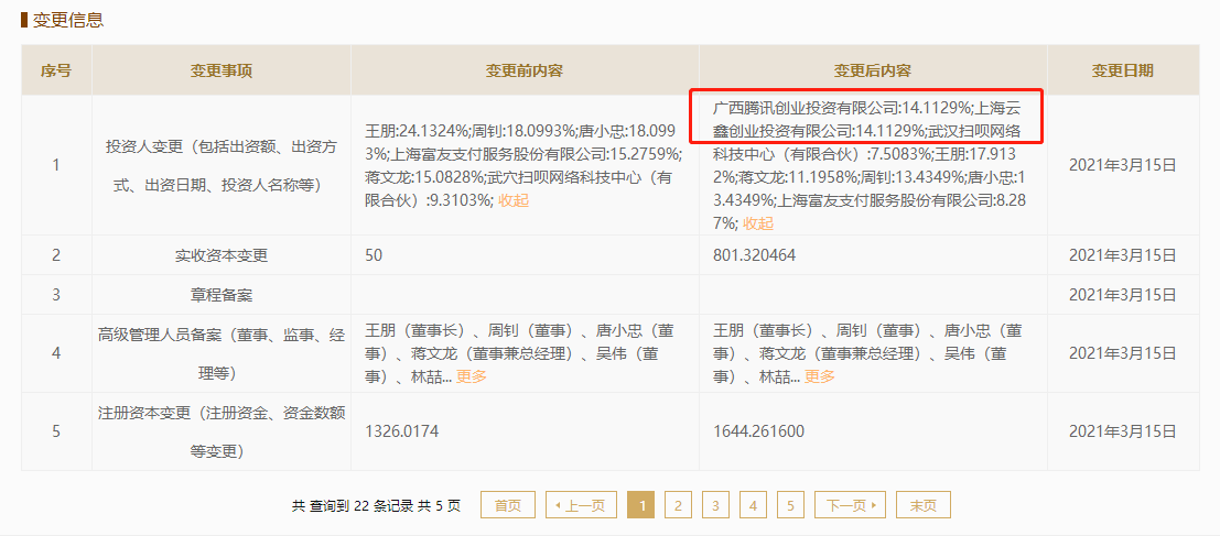 企查查App显示,近日利楚扫呗关联公司武汉利楚商务服务有限公司发生多项工商变更,新增股东广西腾讯创业投资有限公司、上海云鑫创业投资有限公司(蚂蚁集团子公司),两家公司持股比例相同,均约为14.11%。同时,该公司注册资本由约1326万人民币增至约1644万人民币,增幅24%。