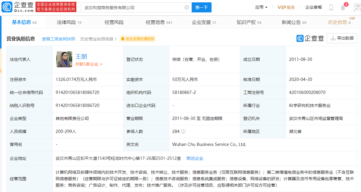 企查查显示,该公司成立于2011年8月,法定代表人为王朋,经营范围包含计算机网络及软硬件领域内的技术开发、技术咨询、技术转让、技术服务;信息服务业务(仅限互联网信息服务)等。
