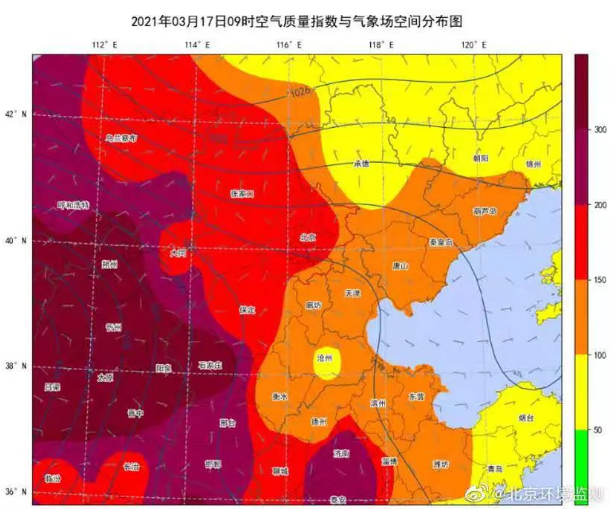 北京市生态环境监测中心分析,昨日白天受高压底部偏北风影响,沙尘主体移出北京,空气质量得到明显改善,达到优良水平。但中午前后,由于整个京津冀区域转受高压后部影响,地面转为西南风,移出北京但并未走远的沙尘逐步从西南方向开始回流,至傍晚已重新覆盖北京。