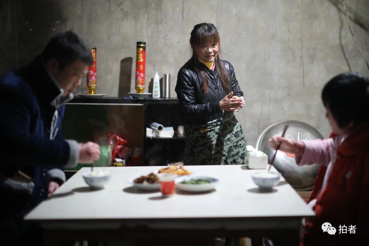 △ 卢永杰的嫂子(中)做好菜并端上了桌,卢永杰(左)和冯兆琴(右)准备吃饭。出院大半年,他们生活还不能完全自理,卢永杰的嫂子会为他们做饭,并帮忙做一下家务。