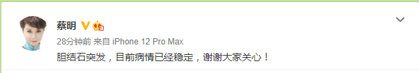 新京报讯 3月19日,有消息称蔡明疑似在录制节目时身体不适,送医治疗。随后,蔡明在社交媒体上发文报平安,她称“胆结石突发,目前病情已经稳定,谢谢大家关心。”