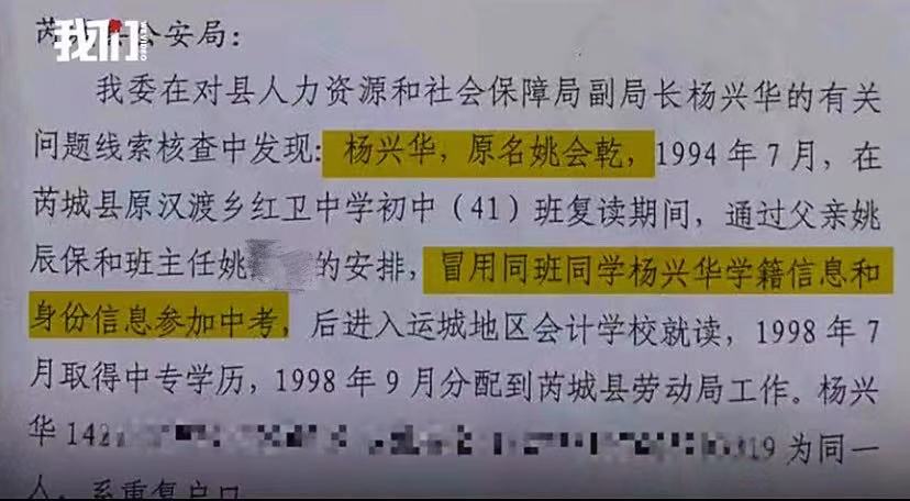 2月22日,山西芮城县监察委员会向县公安局发出一份名为《关于对县人力资源和社会保障局副局长杨兴华有关问题的监察建议书》,其内容显示,“县监察委员会在对县人力资源和社会保障局副局长杨兴华的有关问题线索核查中发现,杨兴华,原名姚会乾,1994年7月,在芮城县原汉渡乡红卫中学初中(41)班复读期间,通过父亲和班主任的安排,冒用同班同学杨兴华学籍信息和身份信息参加中考,后进入运城地区会计学校就读,1998年7月取得中专学历,1998年9月分配到芮城县劳动局工作。杨兴华与姚会乾为同一人,系重复户口。”