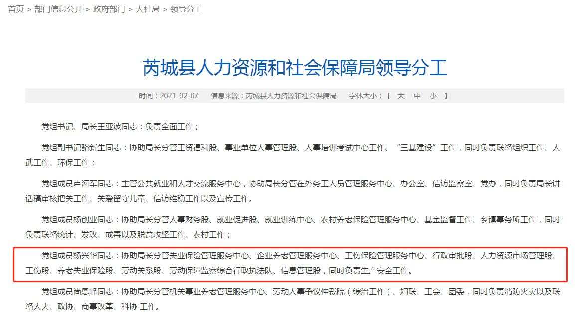 18日,新京报记者从芮城县人民政府官网查询发现,现杨兴华仍为芮城县人力资源和社会保障局副局长,负责协助局长分管失业保险管理服务中心、企业养老管理服务中心、工伤保险管理服务中心、行政审批股、人力资源市场管理股、工伤股、养老失业保险股、劳动关系股、劳动保障监察综合行政执法队、信息管理股,同时负责生产安全工作。