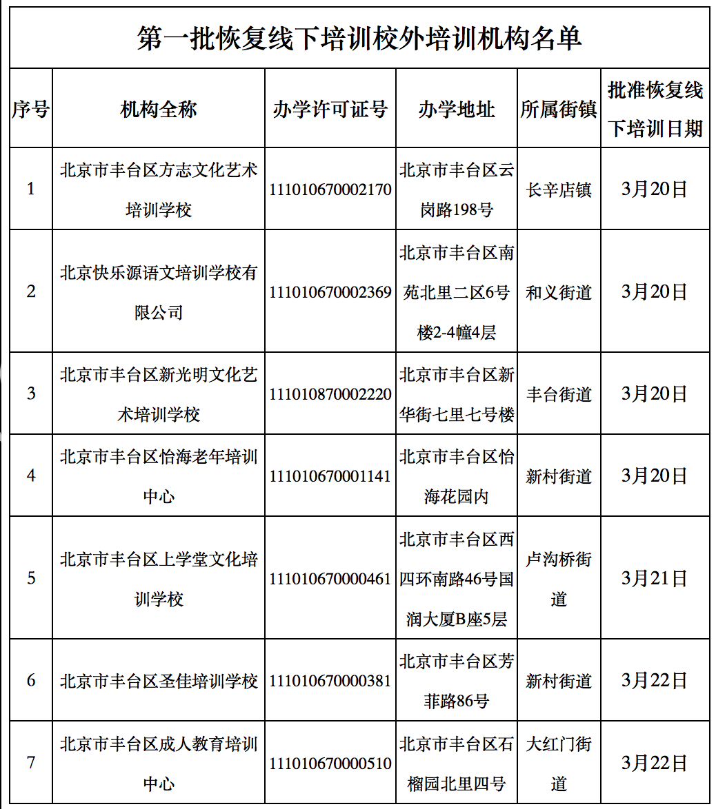 新京报讯(记者 冯琪)3月23日,北京市丰台区教委公布了该区第一批恢复线下培训的培训机构名单,有7家机构通过审核可线下复课。